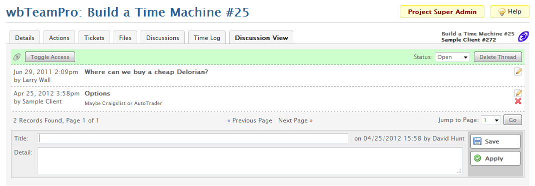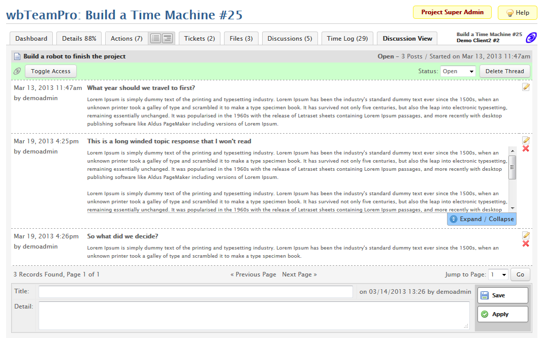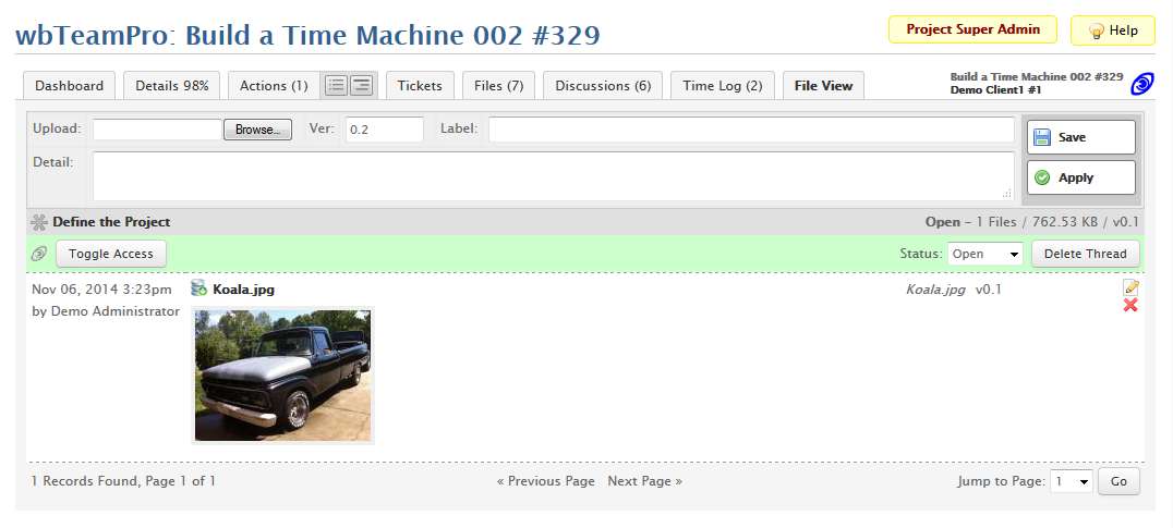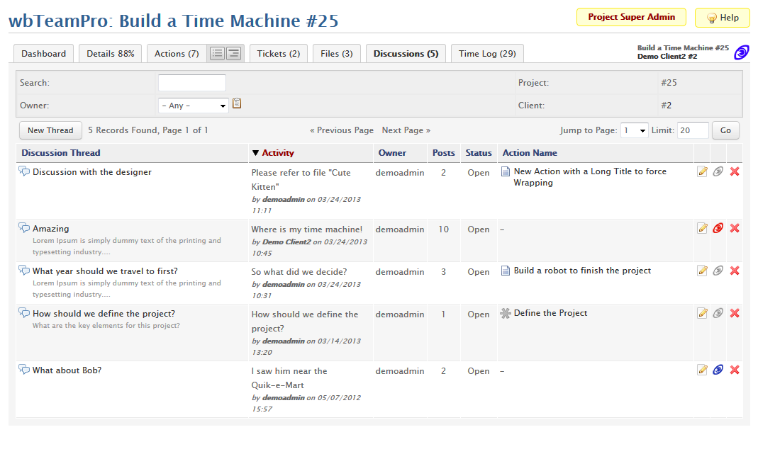 Each project provides a sandbox for team collaboration and asset storage. The File Assets feature of wbTeamPro provides a unique Thread like storage and asset versioning system that allows for tracking of asset changes. The Discussions feature provided with each project provides a common forum style layout for collaboration and idea collection.