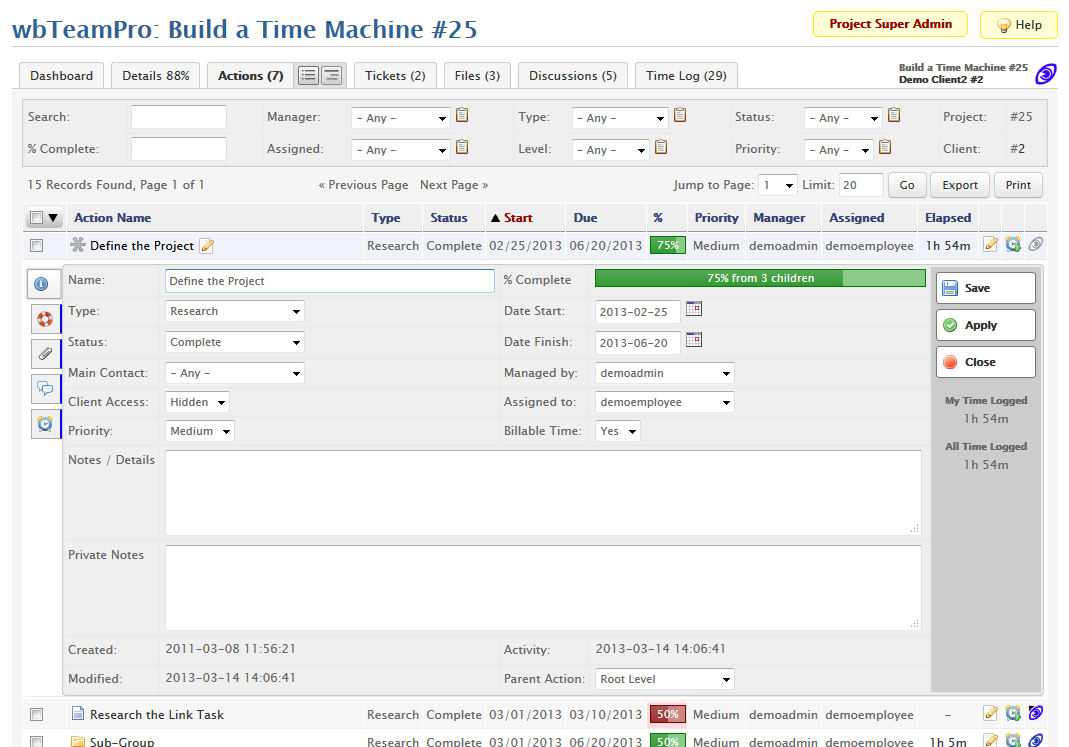 Project Actions are managed via the Actions Tree where new actions can be quickly appended, edited, and arranged throughout the planning and execution of a project. The Action logic uses a Milestone, Task Group, and Task hierarchy that automatically follows the nesting of Tasks within their parent. Milestone and Task Group completion is automatically managed by the completion of Task children, which will each track individual Time Log events toward completion. Additional Actions List and Actions Gantt Chart displays provide a range of interactive methods for managing the activities within each project.