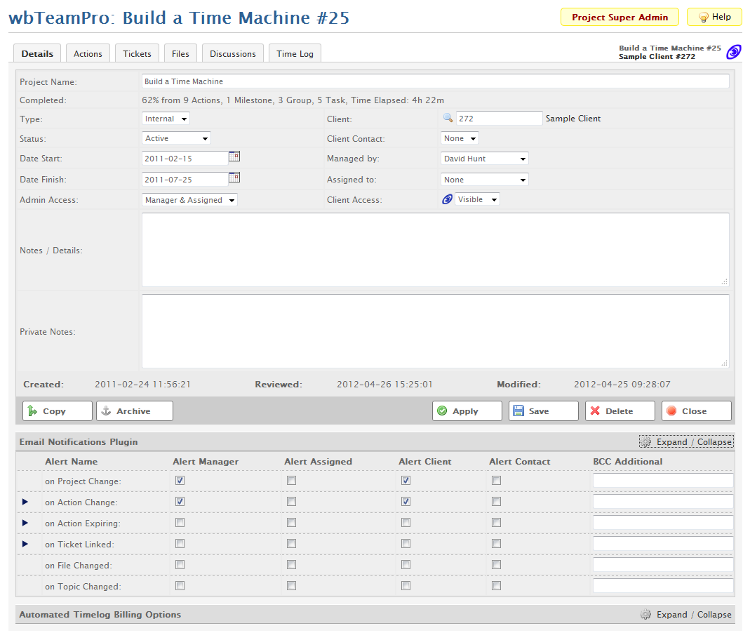 The Client Project Portal provides your clients with an interface for viewing and contributing to a client assigned project. Permissions for client visibility are determined on a per-project basis, including granular controls for allowing limited Action, File, and Topic read / write access.