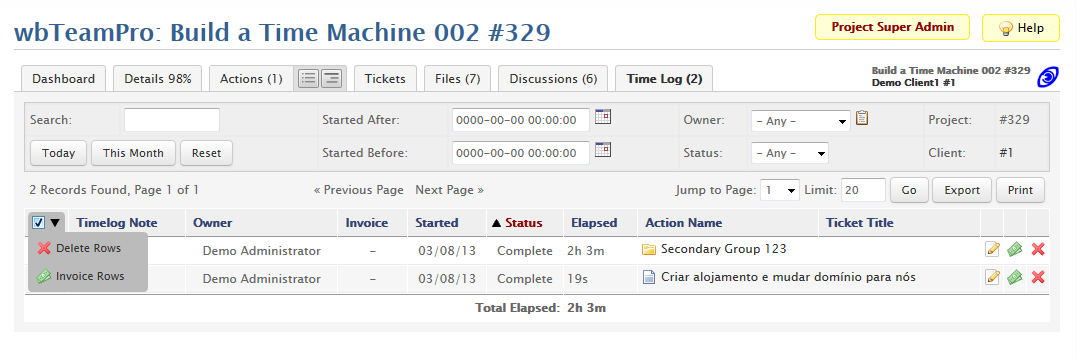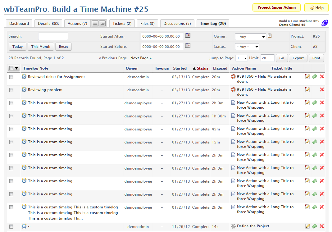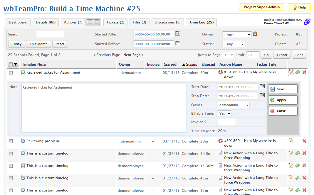 From the standard Ticket dialog wbTeamPro provides a Time log integration, allowing you to monitor the time spent resolving ticket issues. Time log records can be related to a Project or even a specific Action, providing additional metrics for your project.