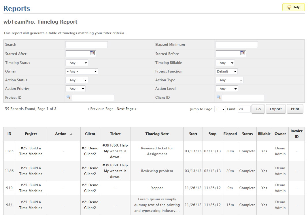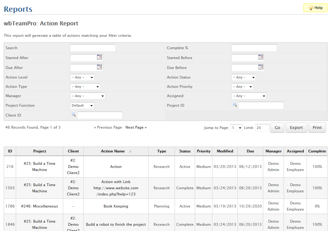 Included with the several list tables within wbTeamPro are Print and Export reports. Each report provides granular filter controls and the ability to print or export the resulting records in a CSV format for use with other data sources.